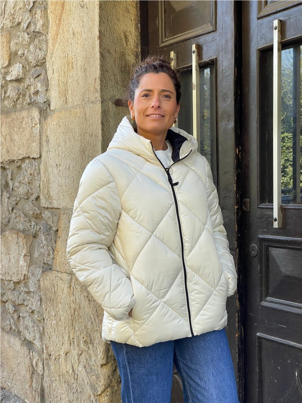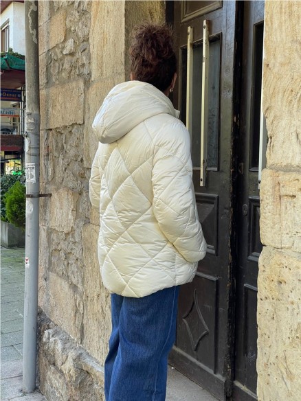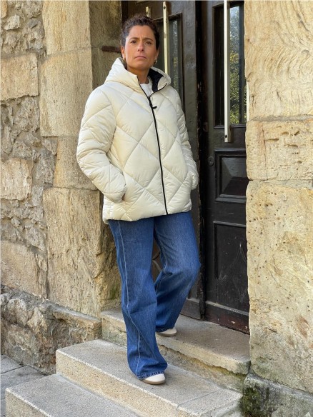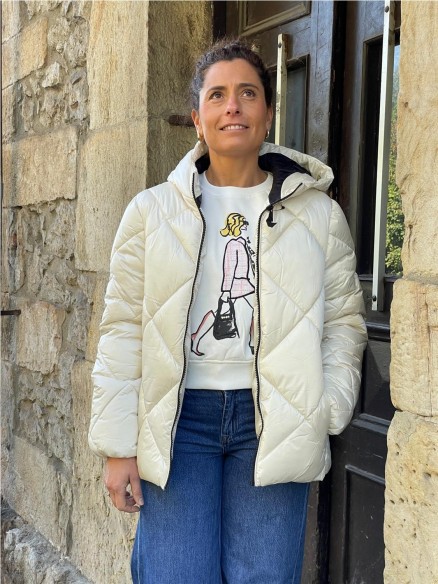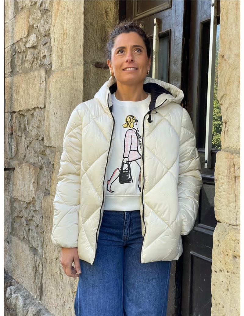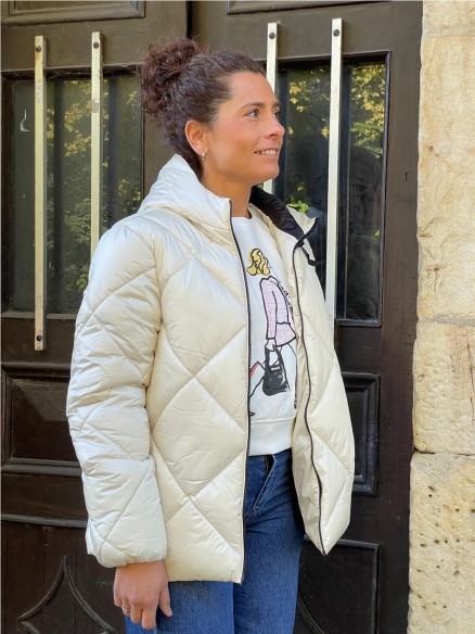 Cazadora santana acolchada, con dos bolsillos frontales y cierre de cremallera. Capucha y manga larga con elástico en los puños.