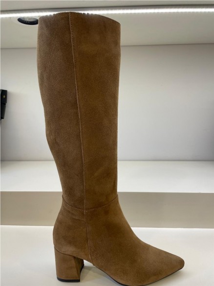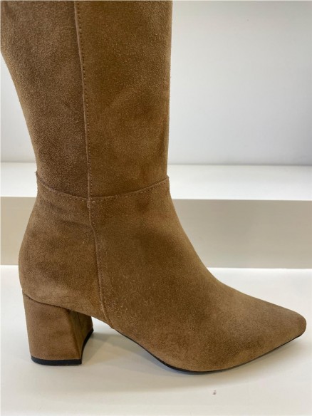 Bota de mujer modelo Leonor en piel ante. Un diseño confeccionado con comodísimo tacón forrado al tono de 6 cm de altura. Cierre mediante cremallera en la parte interna. Plantilla de piel y reforzado con una lagrima de gel para mayor comodidad. Unas botas muy especiales que destacan por su elegancia sin perder la comodidad. Medida caña hasta suelo 45cm Composición: - Tipo: Botas. - Color: CAMEL - Material externo: Piel crimea y suela flexible y antideslizante en TPU.