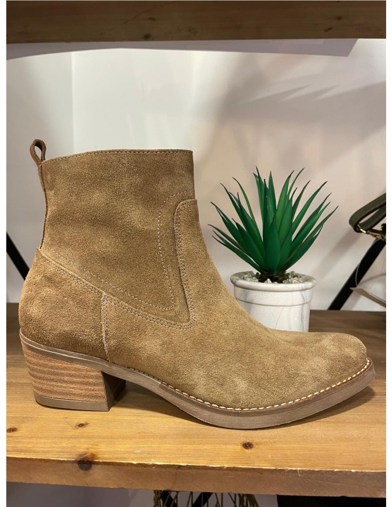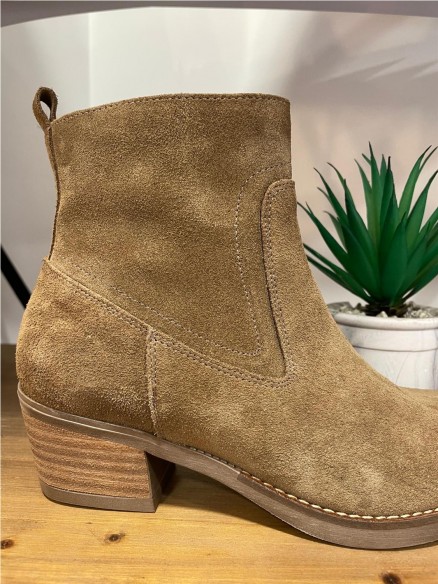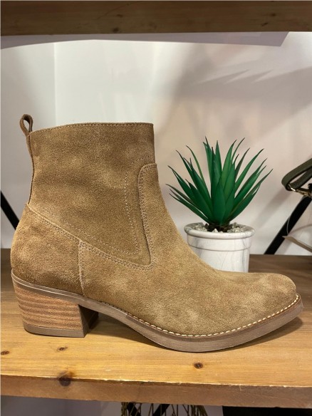 Botín campero de mujer modelo Lucía en piel serraje color taupe. Un diseño confeccionado con un tacón de 4.5 cm de altura y cierre mediante cremallera en la parte interna. Plantilla de piel y reforzado con una lágrima de gel para mayor comodidad. Unos botines muy especiales que destacan por su elegancia sin perder la comodidad que tanto nos representa.