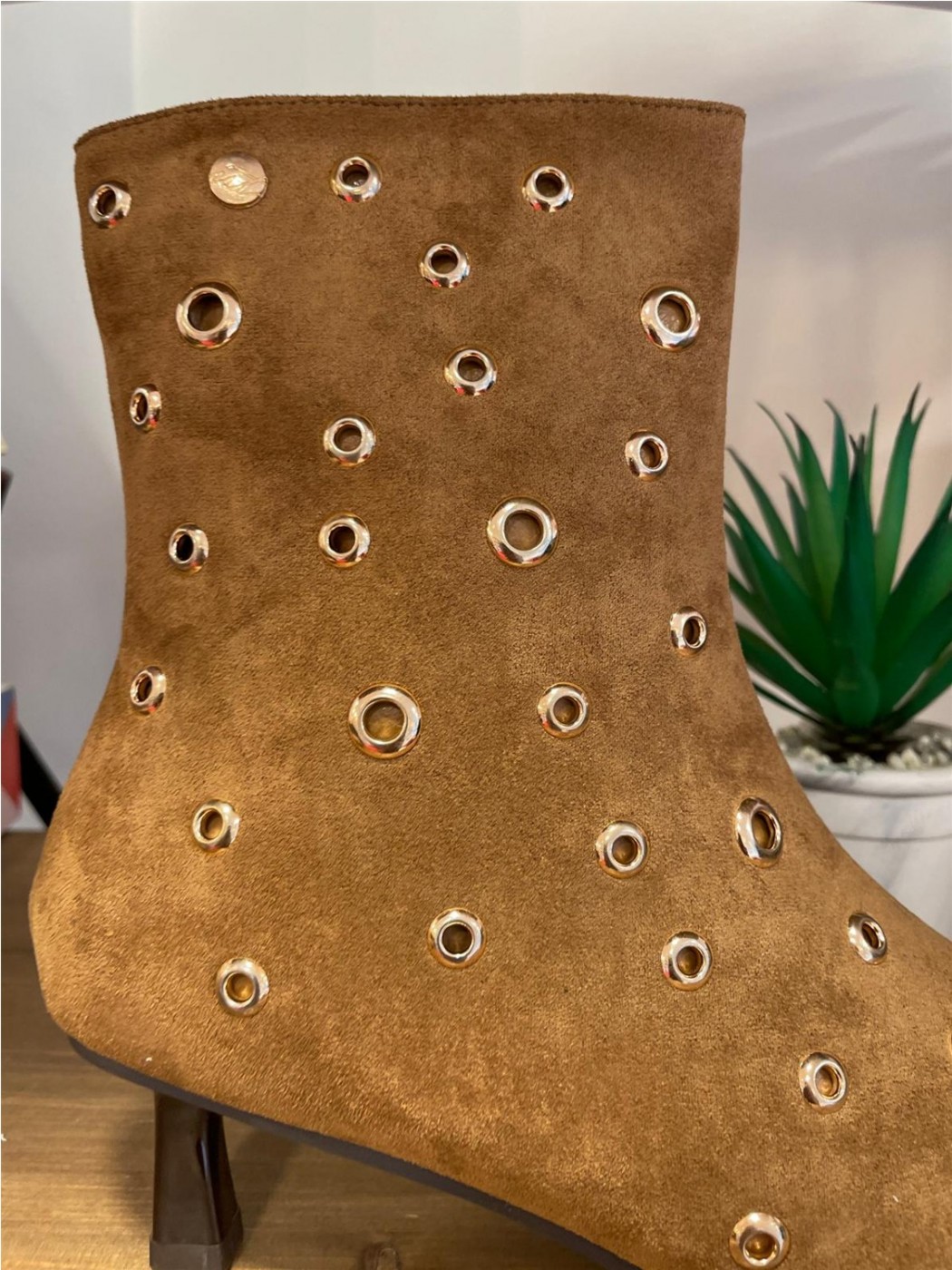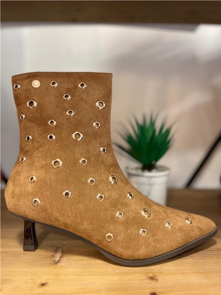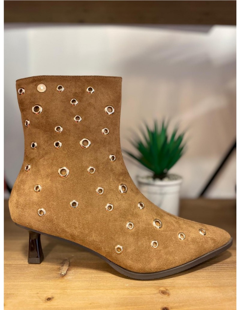 El botín de mujer ISTERIA 556 es un calzado moderno y versátil, diseñado en ante sintético de color marrón con detalle de remaches decorativos que aportan un aire actual y sofisticado. Cuenta con cierre de cremallera interior que facilita el calce, además de plantilla acolchada en sintético y forro textil suave, garantizando comodidad y confort en cada uso. Su tacón fino de 5 cm estiliza la silueta manteniendo la comodidad, mientras que la suela de caucho antideslizante ofrece estabilidad