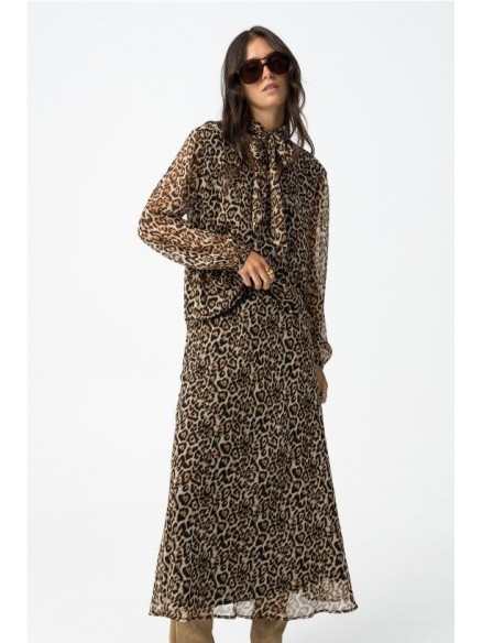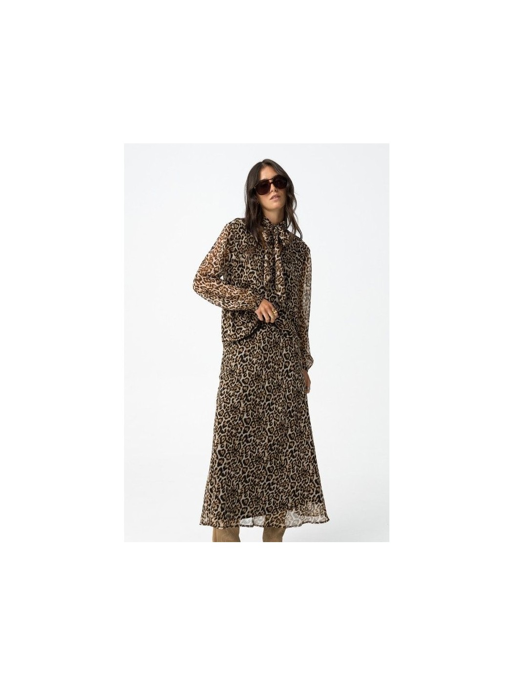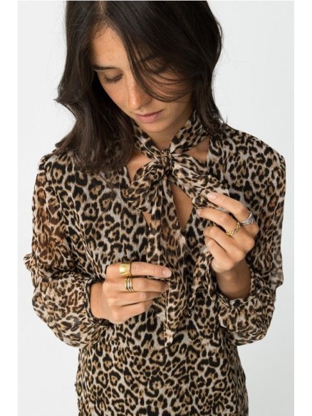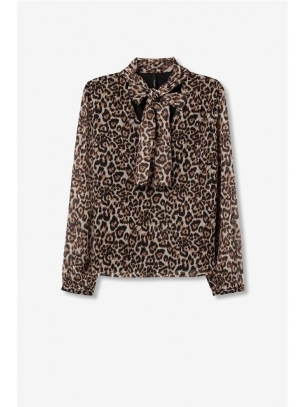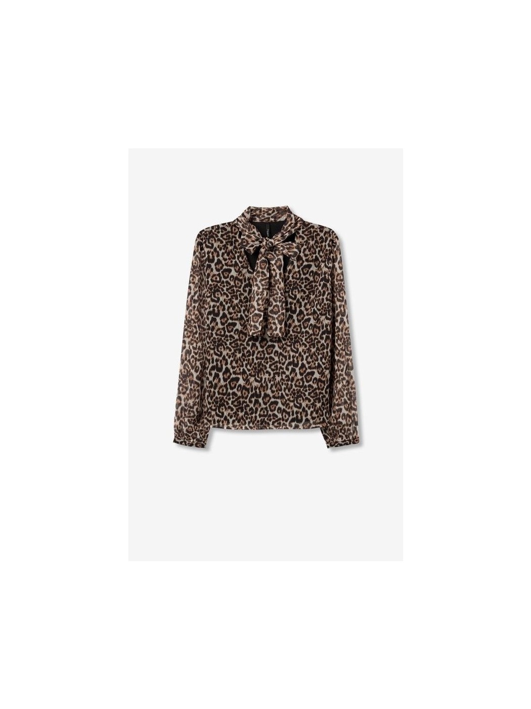 Blusa regular fit estampada, con lazo frontal, cuello en V y manga larga con botones en los puños.