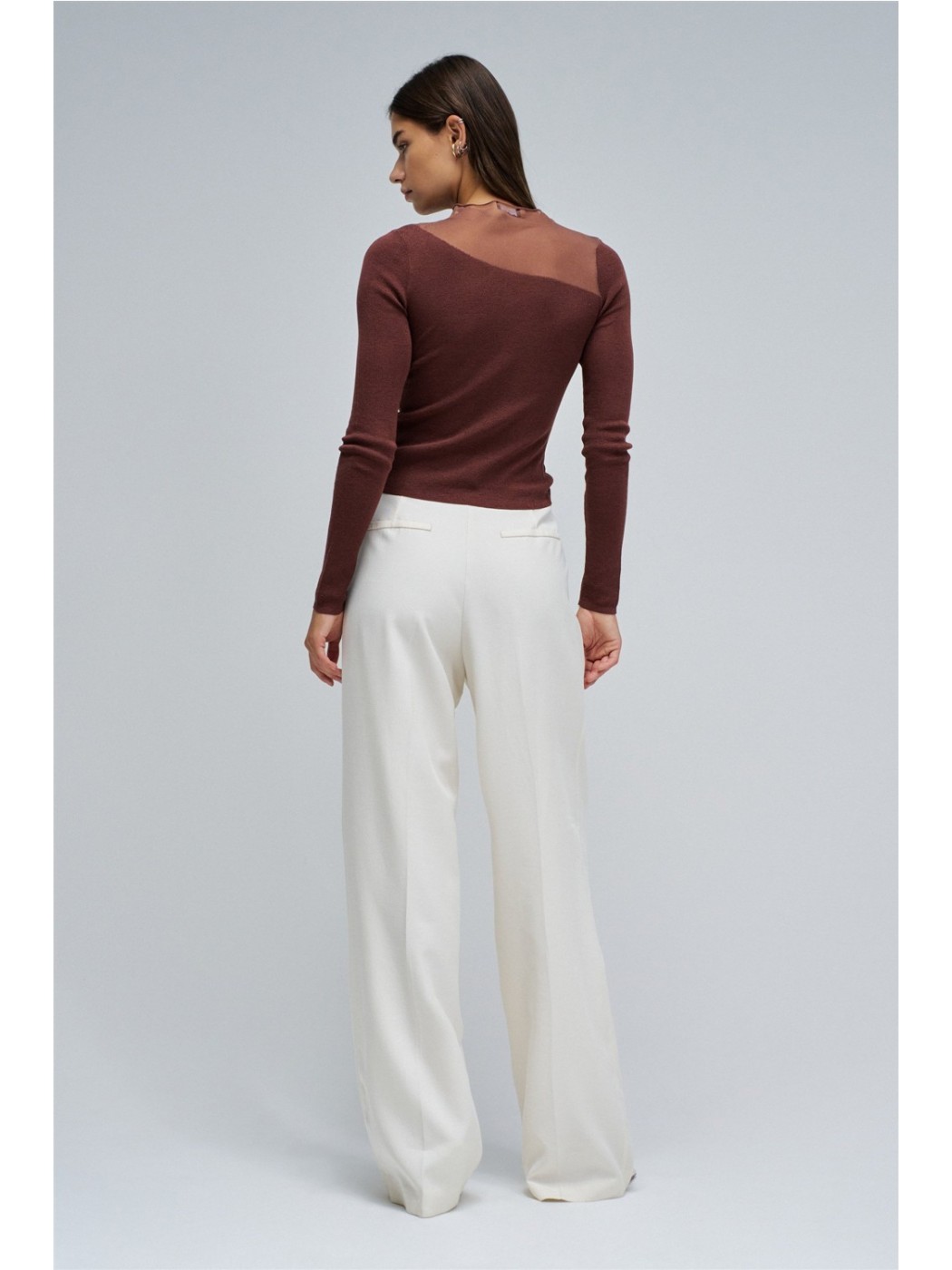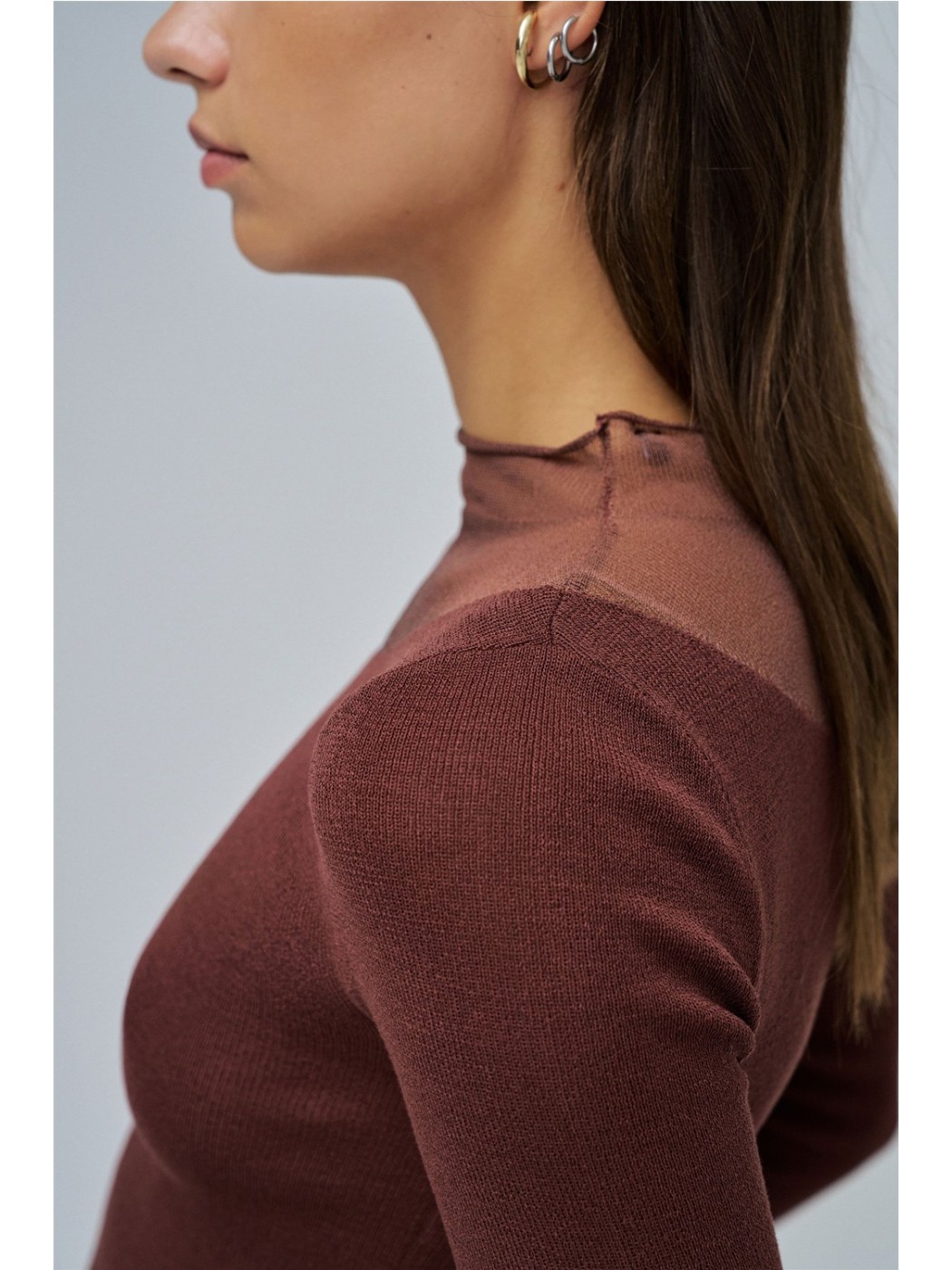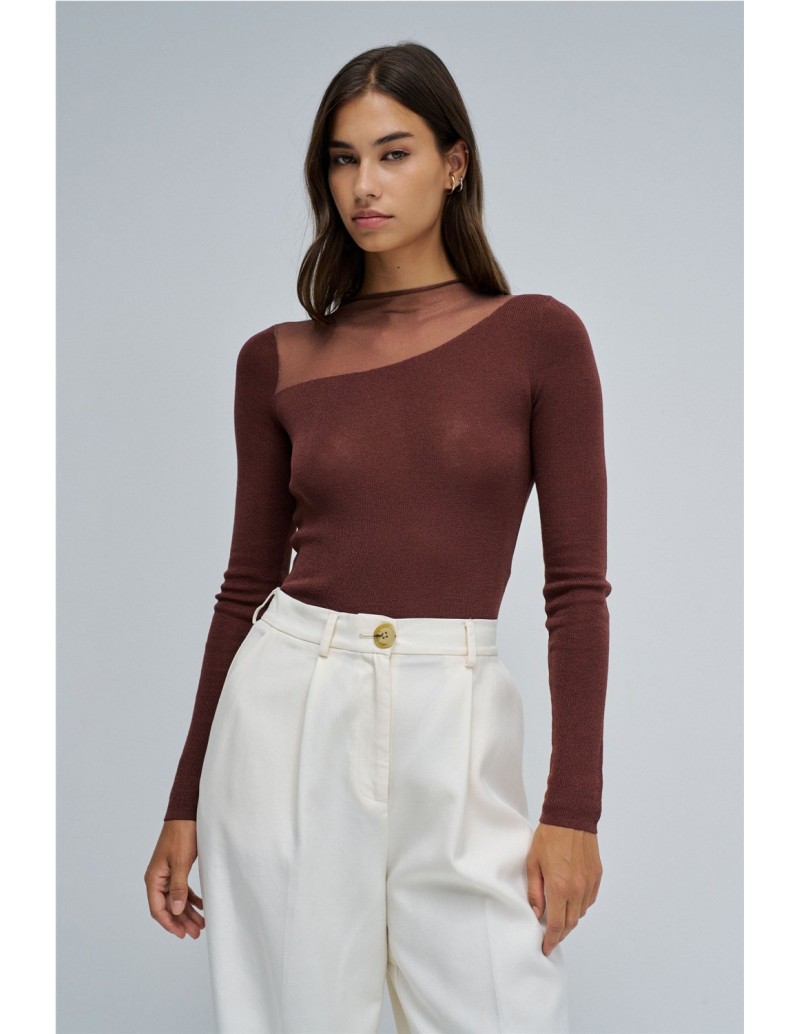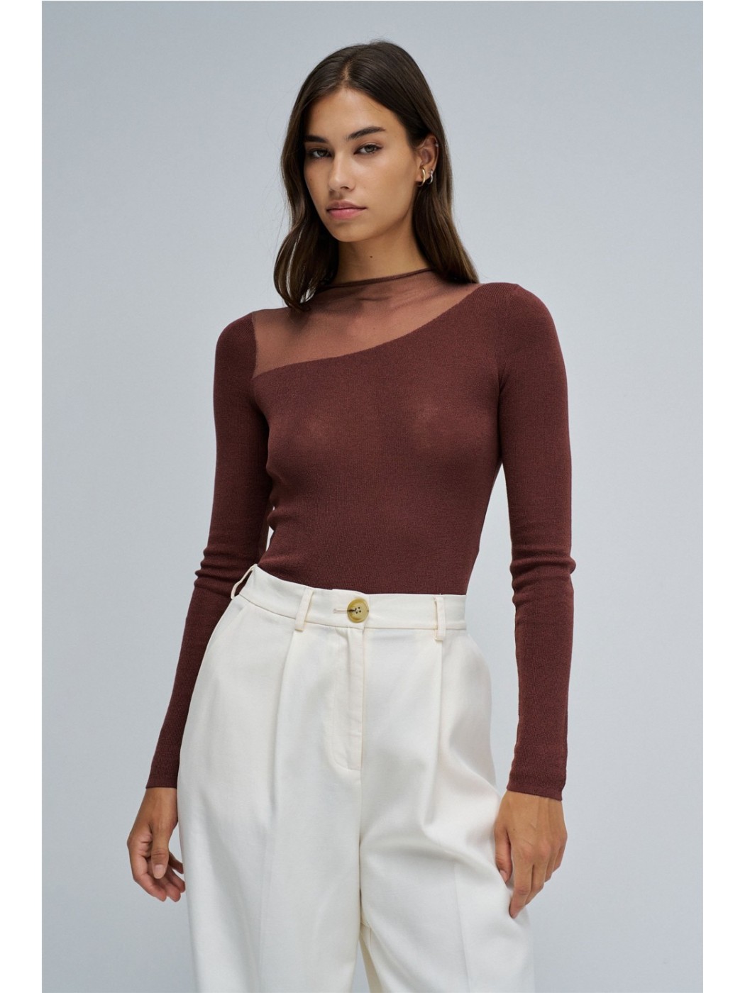 Jersey elegante, marcado por un escote asimétrico con transparencia que añade un toque moderno y sofisticado. El ajuste slim valora la silueta, mientras que el tono marrón aporta calidez y versatilidad al look. Ideal para combinaciones que equilibran feminidad y actitud. - Jersey con transparencia - Color marrón - Ajuste slim - Manga larga - Escote asimétrico con transparencia