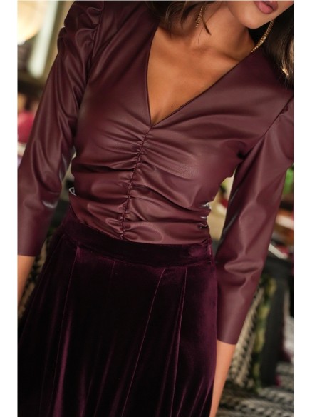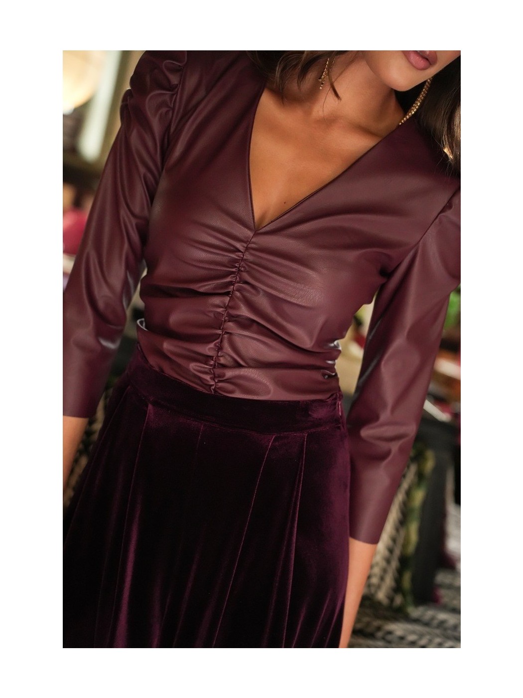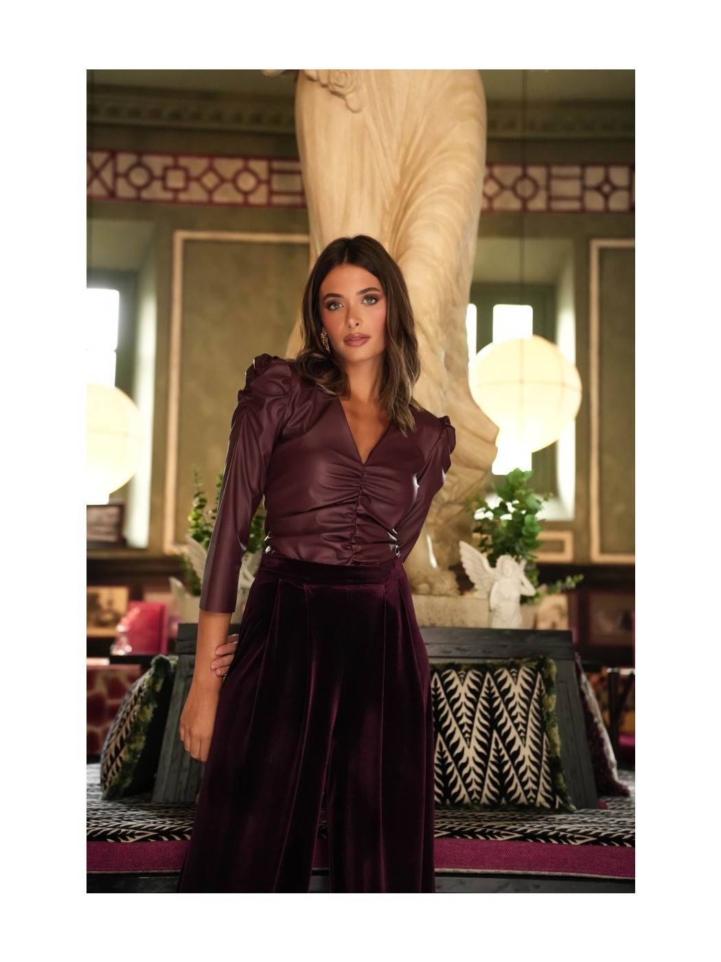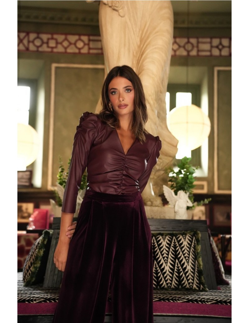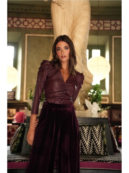 El top creus redefine la feminidad con un toque contemporáneo y sofisticado. Una prenda versátil y chic, ideal para cenas, eventos o celebraciones donde quieras destacar con personalidad. Este top está confeccionado en tejido efecto cuero que aporta carácter y modernidad. El fruncido central en el delantero estiliza la figura y realza el escote en pico. Las mangas ligeramente abullonadas añaden volumen y elegancia, creando un equilibrio perfecto entre fuerza y sutileza.