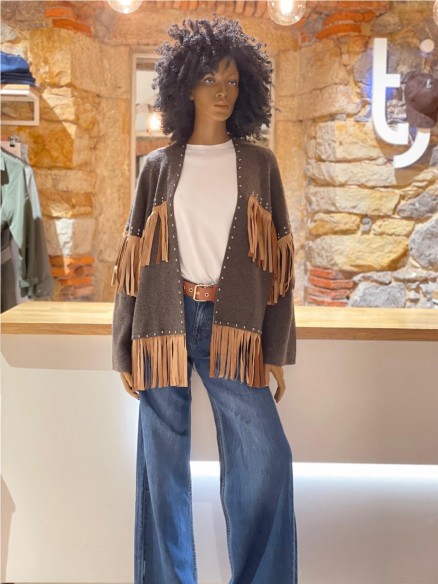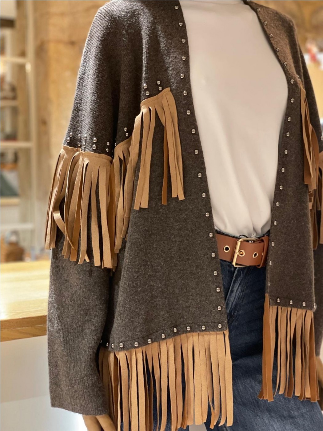 Chaleco de punto con flecos para mujer, color marrón otoño/invierno, mezcla de lana y poliéster, ideal para dar un toque cálido y estiloso a tus conjuntos.