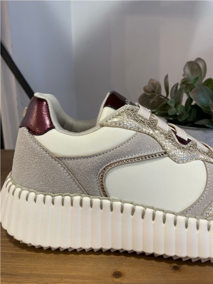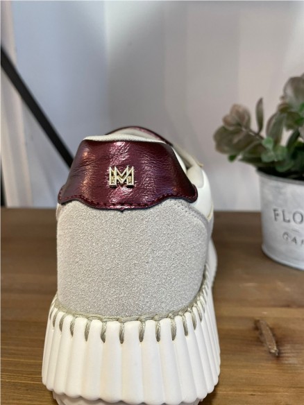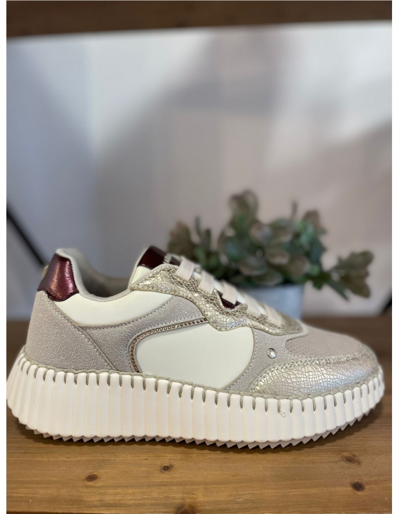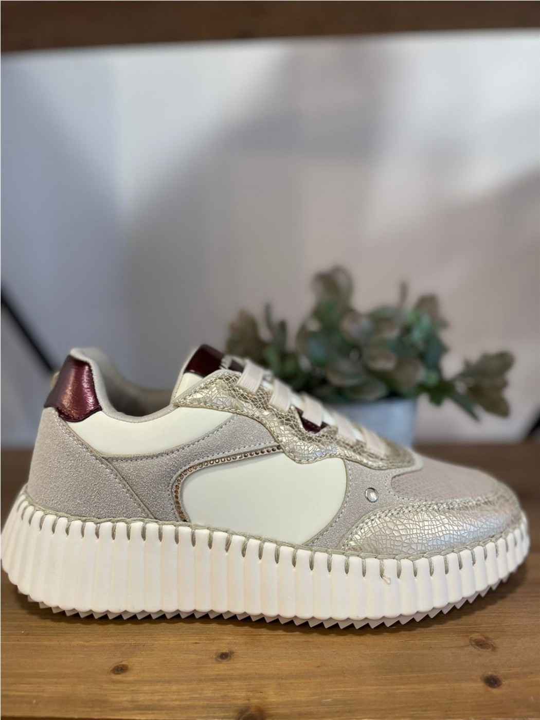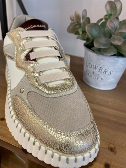 Zapatillas de cuña de color champagne para mujer, modelo Ancora de Mariamare. Su diseño combina paneles en tonos beige con acabados metalizados dorados, texturas tipo ante y detalle en burdeos metalizado en la zona del talón y lengüeta. Destaca su suela ancha con estrías pronunciadas, que añade un toque moderno y mayor agarre al caminar con su toque dentado. El cierre con cordones planos y el logo de la marca en dorado completan un look casual y actual.