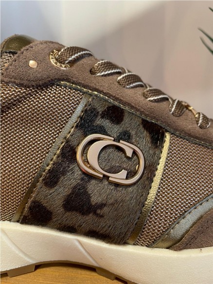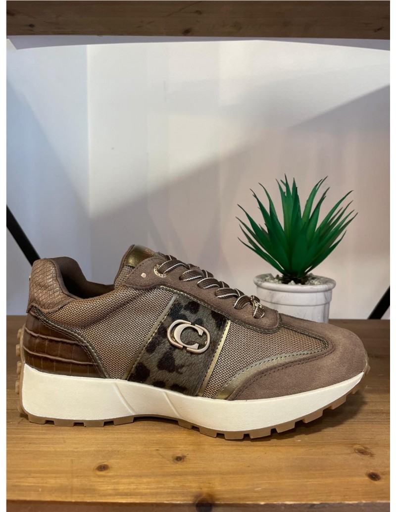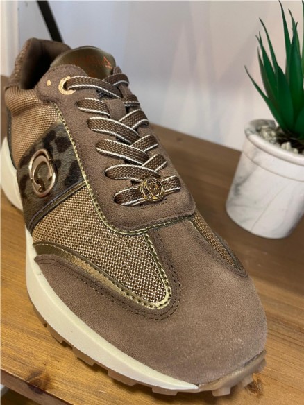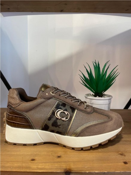 Zapatilla de mujer, de la marca Carmela. Fabricado en material que imita la piel con bonito grabado en coco. Detalle lateral metalizado. Suela antideslizante. Plantilla extraíble.