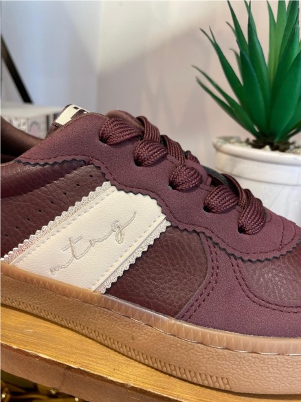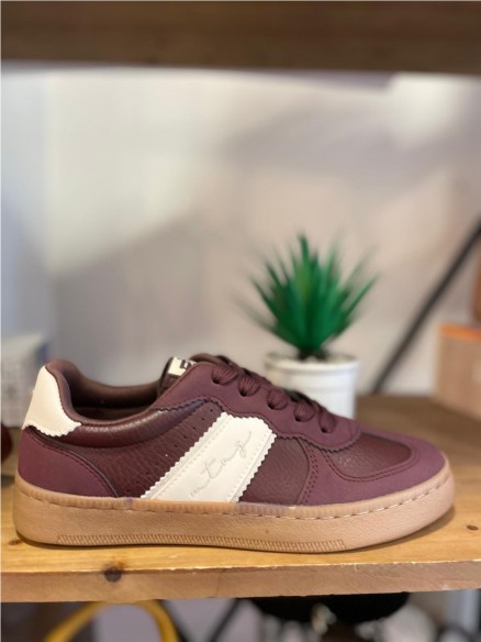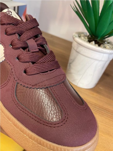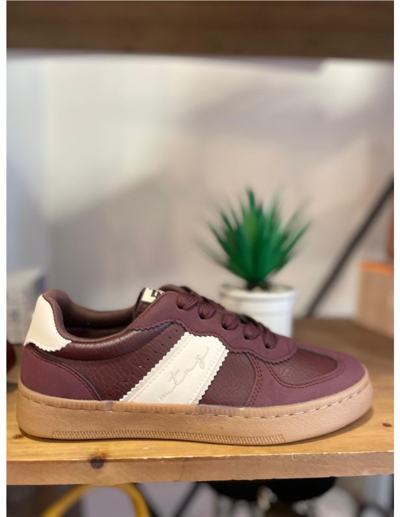 Zapatillas casual de color marrón oscuro para mujer de la marca Mustang, modelo Roy, con detalles en dorado metalizado. Presenta un diseño retro con puntera redondeada, suela en tono caramelo y paneles texturizados que combinan diferentes acabados. Los laterales llevan el logo bordado y franjas en contraste, aportando un estilo deportivo con toques actuales. Perfecta para el uso diario, combina comodidad y diseño para looks relajados con un punto original.