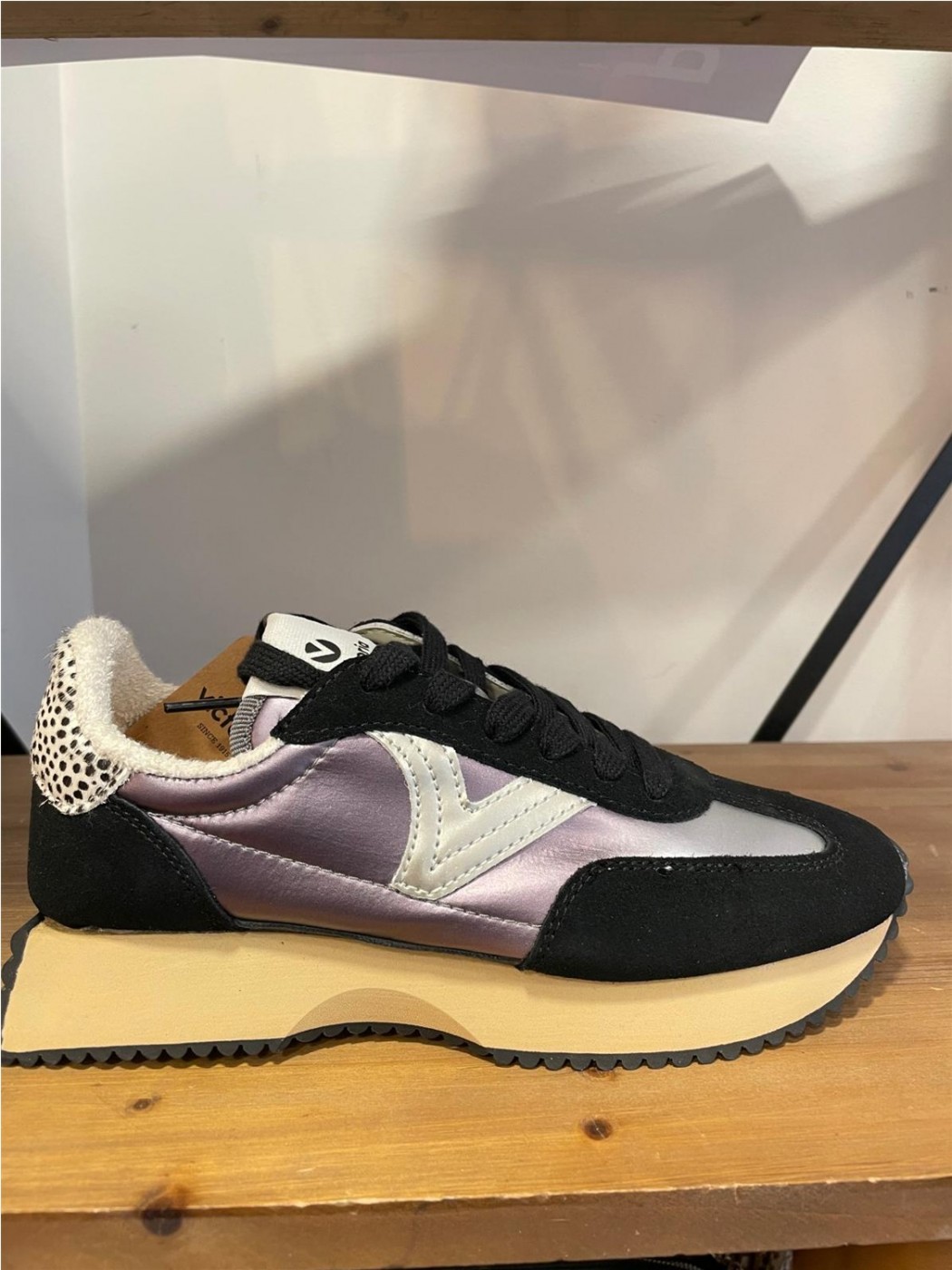 Sneakers para mujer confeccionadas en nylon con piezas de serraje y detalles metalizados y en animal print. Cierre mediante cordones al tono. Interior de rizo. La suela tostada y el patín dentado en negro añaden un toque dinámico y desenfadado. Además, incluyen plantilla extraíble para mayor comodidad y versatilidad.