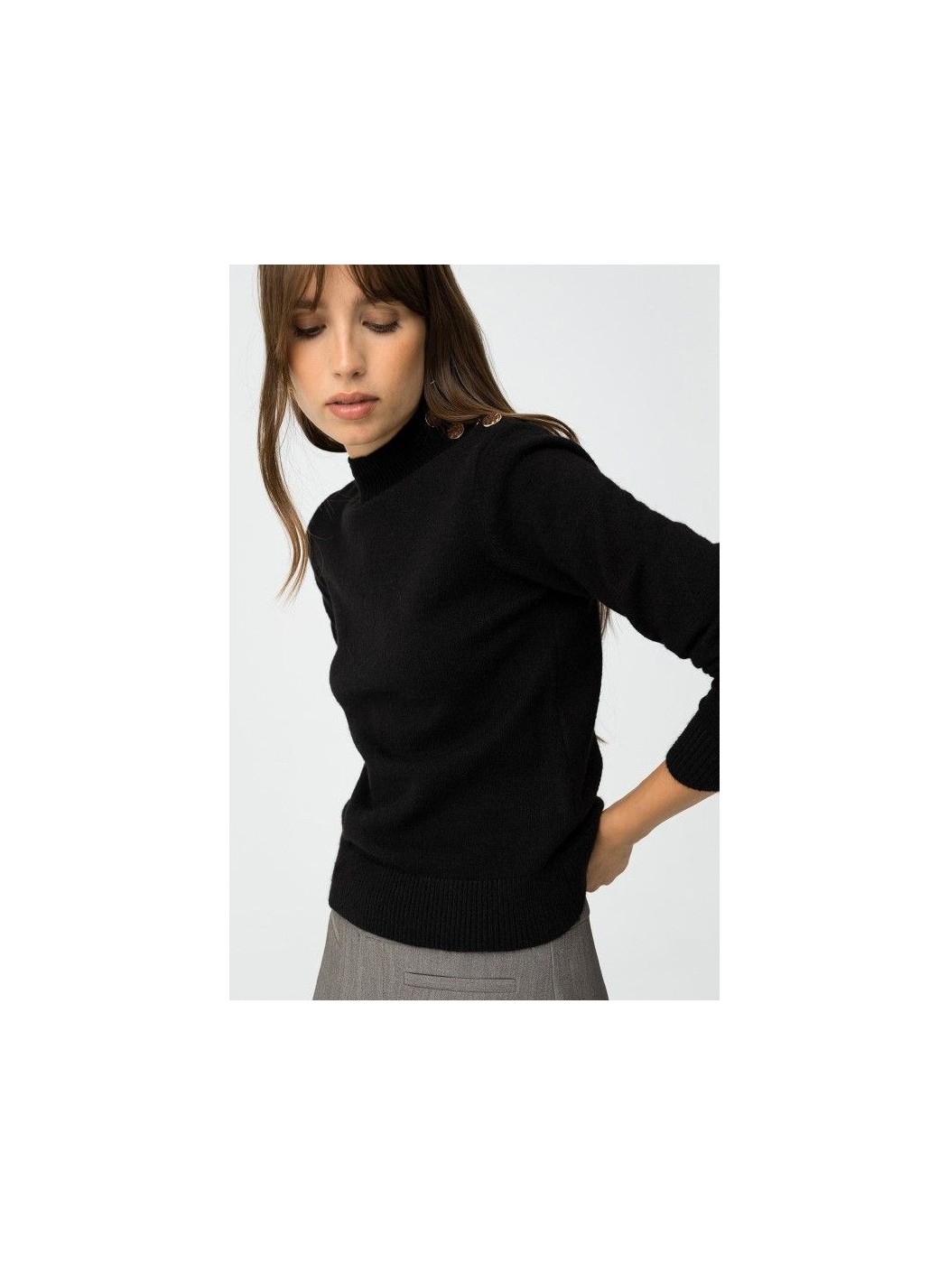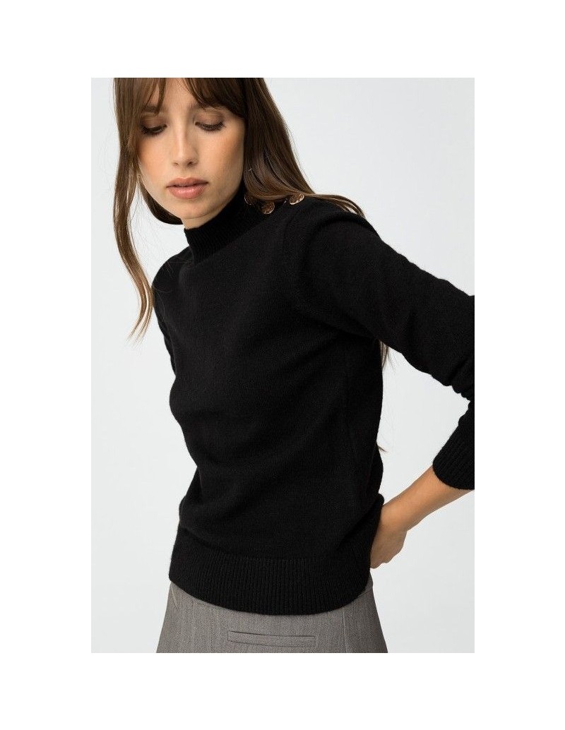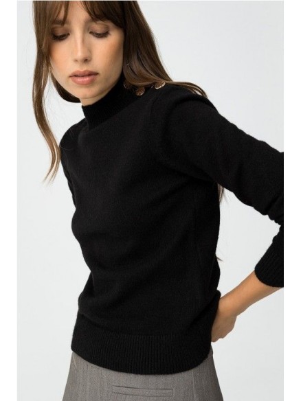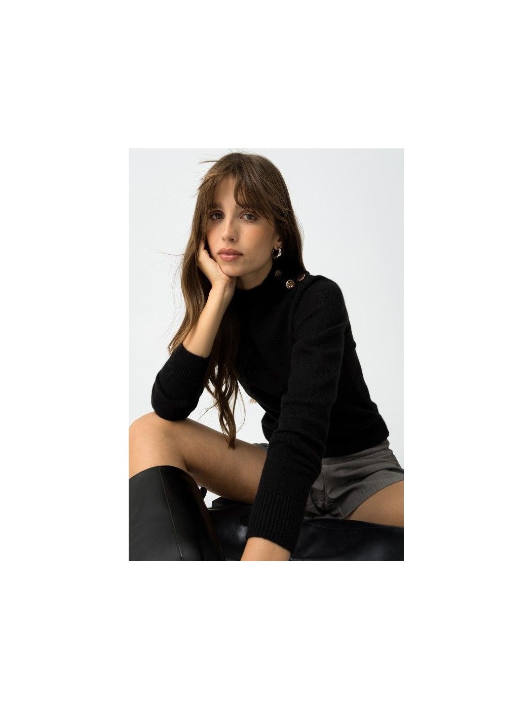 Jersey con botones metálicos en los hombros, cuello alto y manga larga.