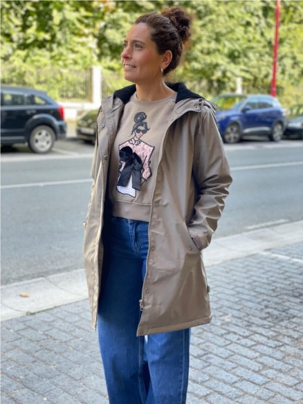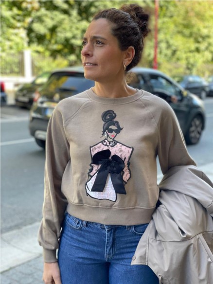 Este jersey presenta un estampado con motivo, confeccionado en felpa ligera con cuello redondo, bordado delicado, cintura y bordes elásticos, mangas raglán y un tacto suave, elaborado mediante una producción respetuosa con el medio ambiente.