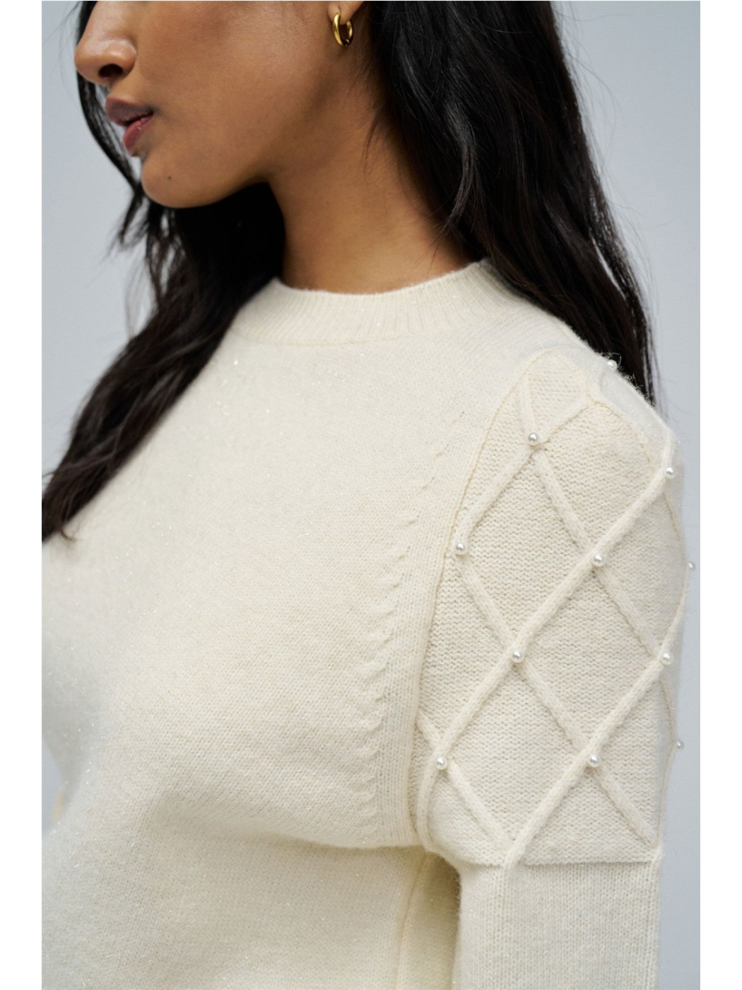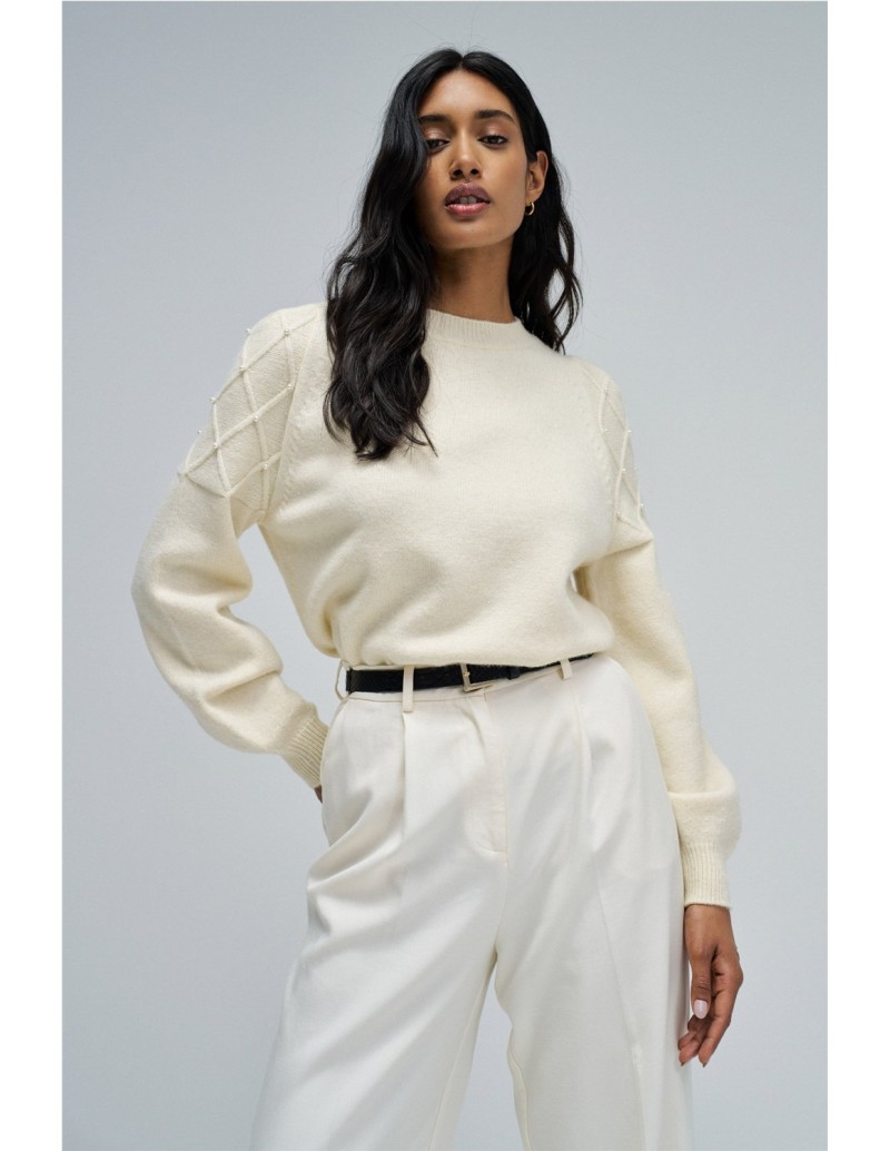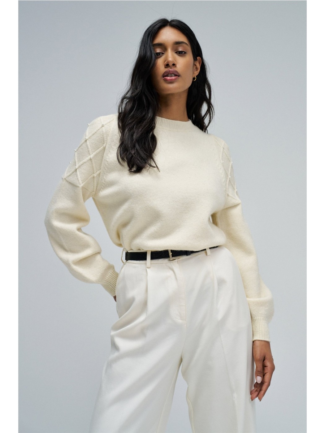 Jersey de punto en tono crudo, marcado por la elegante simplicidad del escote redondo y por el delicado toque de las perlas aplicadas en las mangas. Con corte regular y acabado acanalado en los puños y la cintura, combina comodidad y sofisticación en igual medida, perfecto para elevar los looks del día a día con un detalle femenino y refinado. - Jersey de punto - Color crudo - Corte regular - Manga larga - Escote redondo - Detalle de perlas en las mangas - Puños y cintura ac