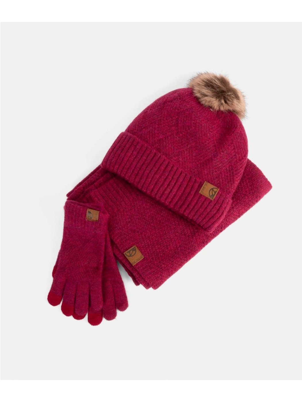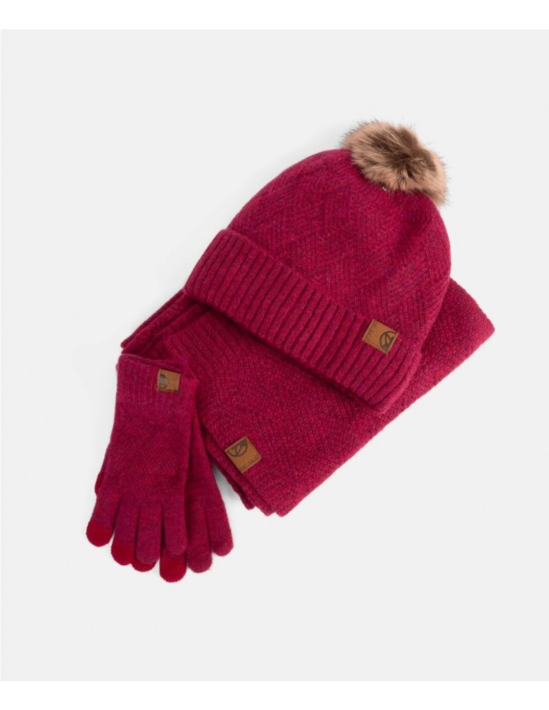 Este pack gorro, guantes y bufanda 252852 combina elegancia y funcionalidad con un patrón de espiga que le da un aire sofisticado. Incluye gorro con pompón, bufanda versátil y guantes compatibles con pantallas táctiles. Todo en un tejido cálido y texturizado perfecto para los días más fríos.