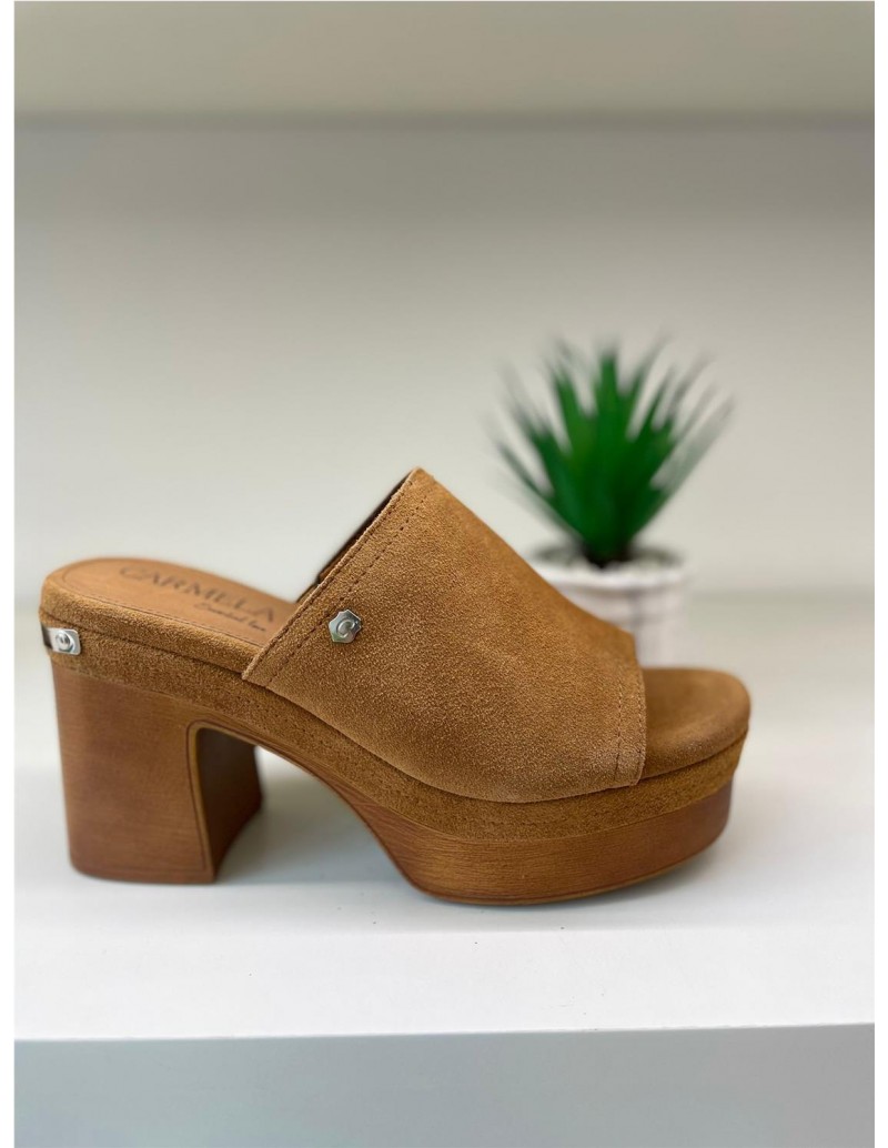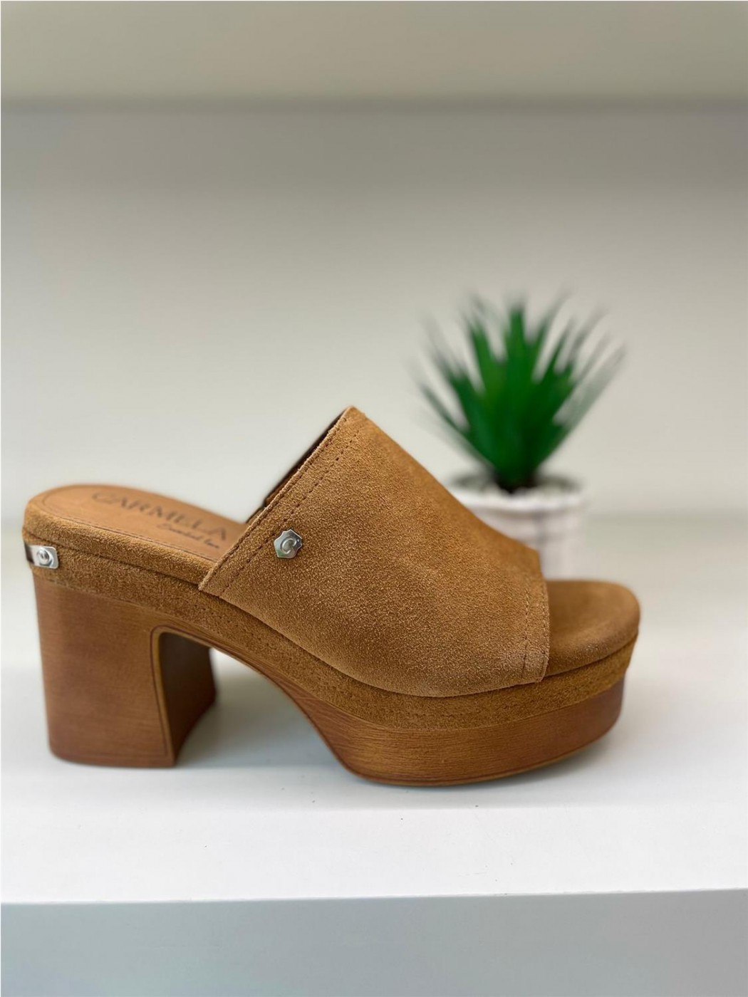 Zuecos de piel con tacón ancho Carmela 160677 para mujer en color marrón. Características: Destalonado, tacón 9 cm y plataforma 3,5 cm, zapato de estilo casual, suela de goma, exterior piel serraje, forro interior y plantilla piel.