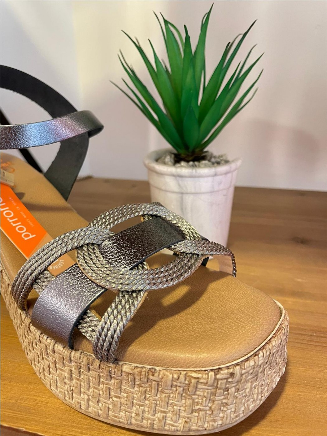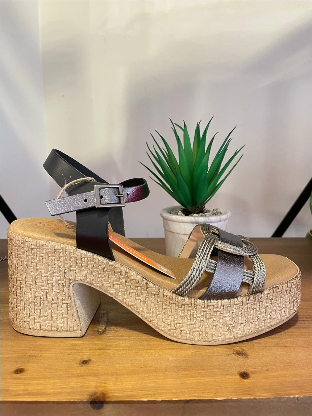 Sandalia con original pala textil y piel entrelazada al tono. Talón de piel con cierre mediante pulsera ajustable al tobillo con hebilla metálica. Plantilla acolchada de piel que garantiza una gran comodidad. Tacón de 8 cm y plataforma de 3 cm. Fabricado artesanalmente en España.
