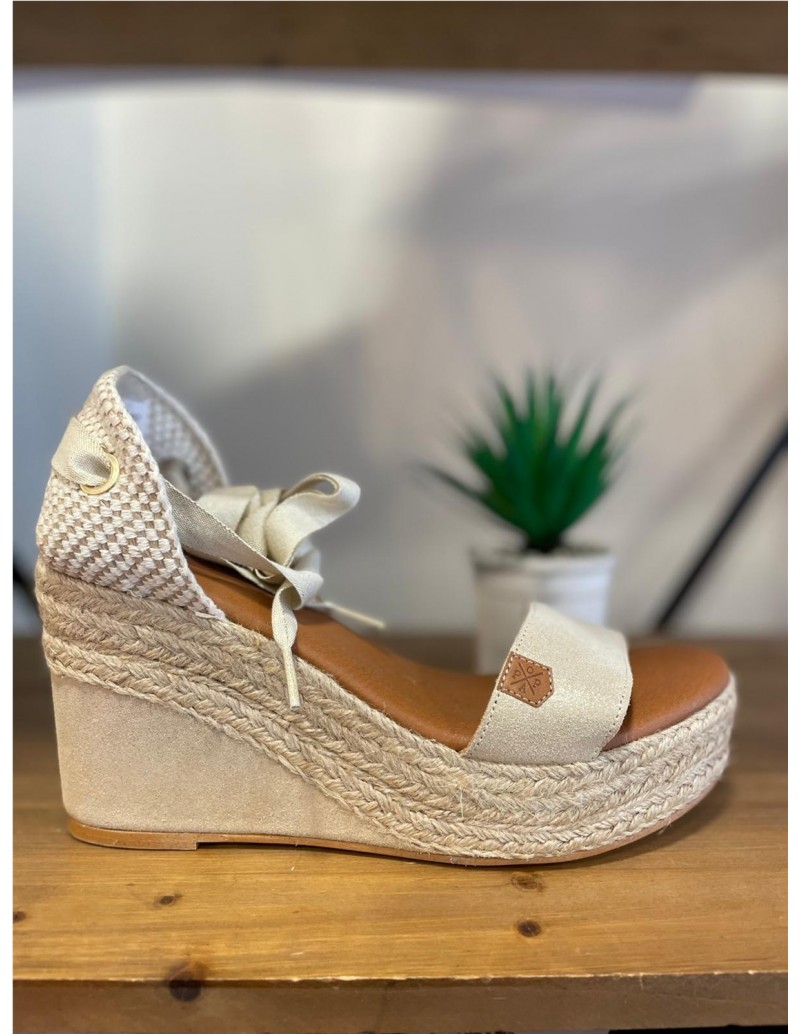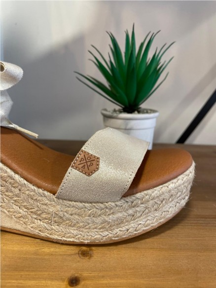 Sandalia piel con cuña combinada con rafia, planta de gel