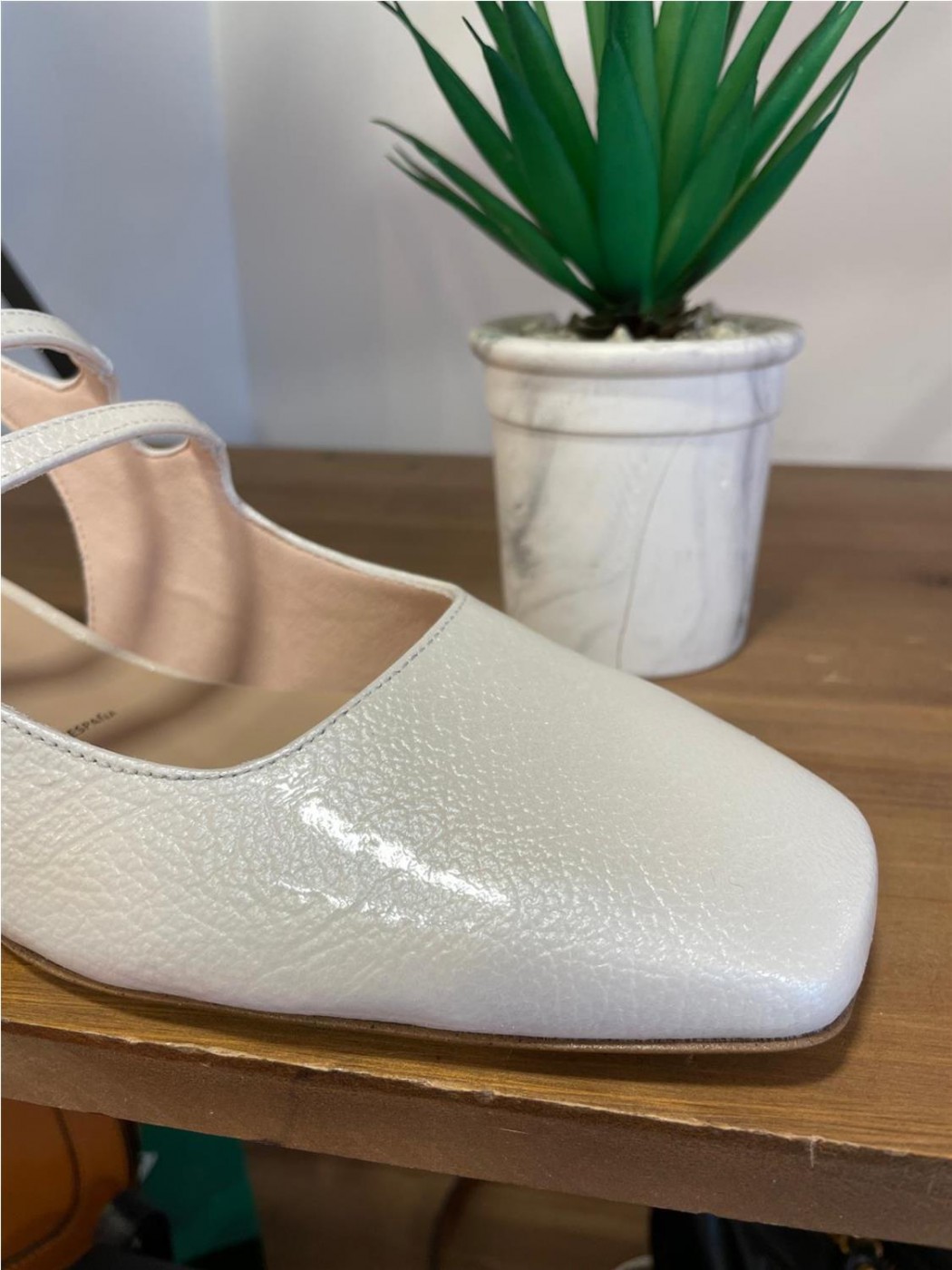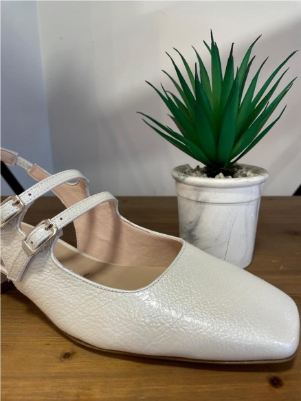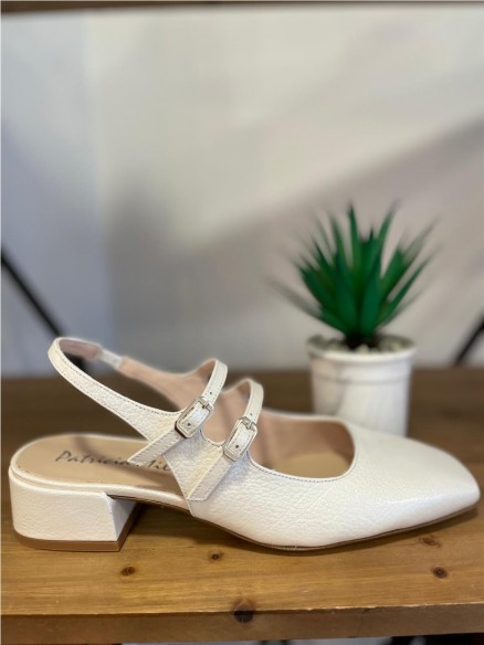 Zapato de salón destalonado de mujer modelo en piel color hielo de charol. Cierre de 2 trabillas